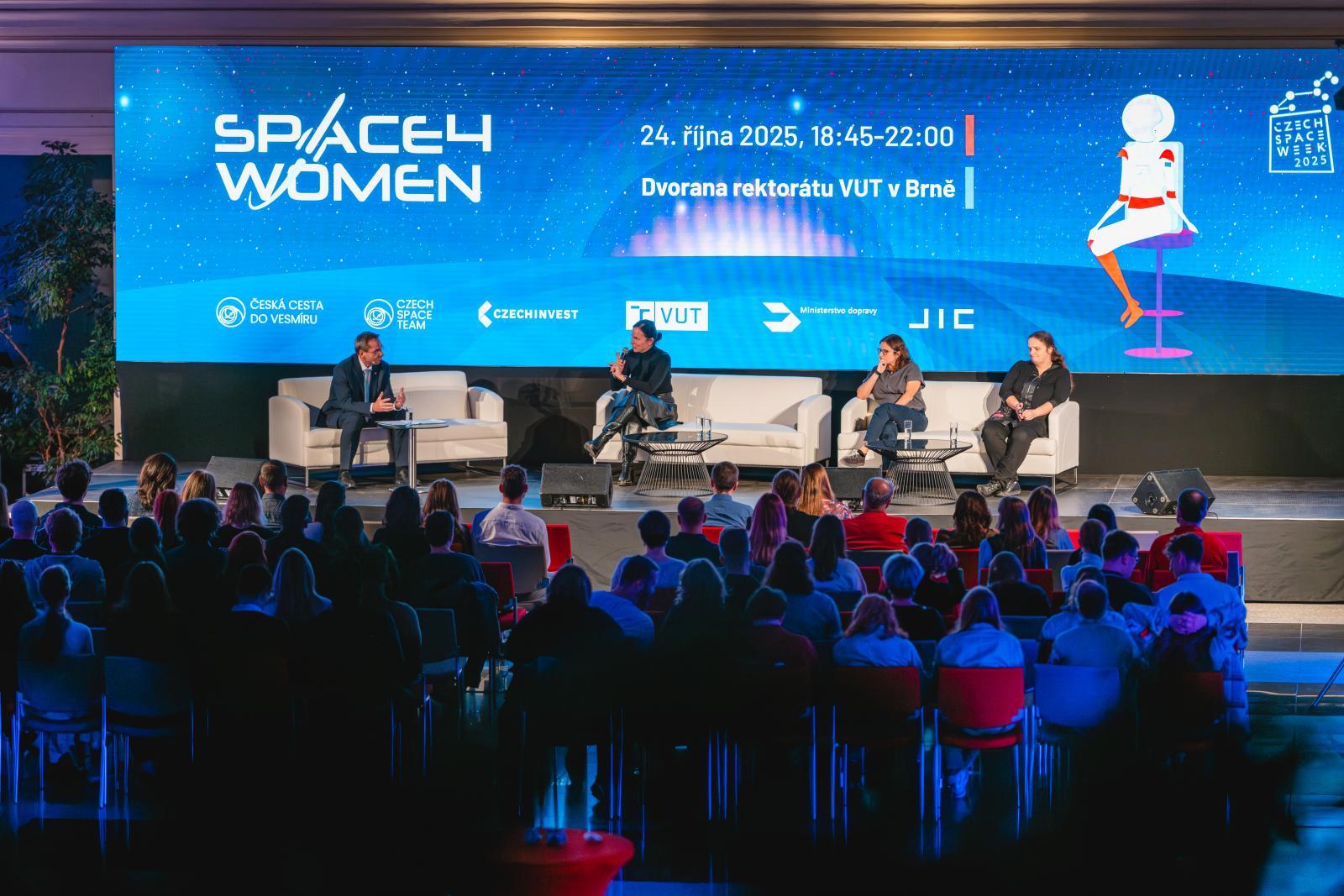 The festival also included the traditional Space4Women talk show, held on 24 October in the atrium of the BUT Rectorate. The discussion introduced four women working in the space sector – Soňa Ehlerová, an astronomer at the Czech Academy of Sciences and Czech delegate to the European Southern Observatory; Natálie Gogolová, a systems engineer at Spacemanic who contributed to the Veronika, GRBBeta, CroCube and LasarSat satellites; Julie Vašků Dobrovolná, the university coordinator for space research at Masaryk University; and Terezie Němcová, a populariser of space law and export control specialist in the aerospace sector with experience from ESA and Airbus.The traditional Space4Women talk show took place on 24 October in the atrium of the BUT Rectorate. | Author: Jakub RozboudThe debate was moderated by BUT Rector Ladislav Janíček, a long-term supporter of women in technical fields. The aim was to inspire female students and young women not to hesitate to enter a sector often perceived as male-dominated. The discussion highlighted that the diversity of approaches and experiences is precisely what pushes the boundaries of space research. At the end of the talk show, a formal announcement was made regarding the establishment of the Czech chapter of Women in Aerospace Europe – a non-profit organisation promoting opportunities for women at all levels of the European aerospace sector.
