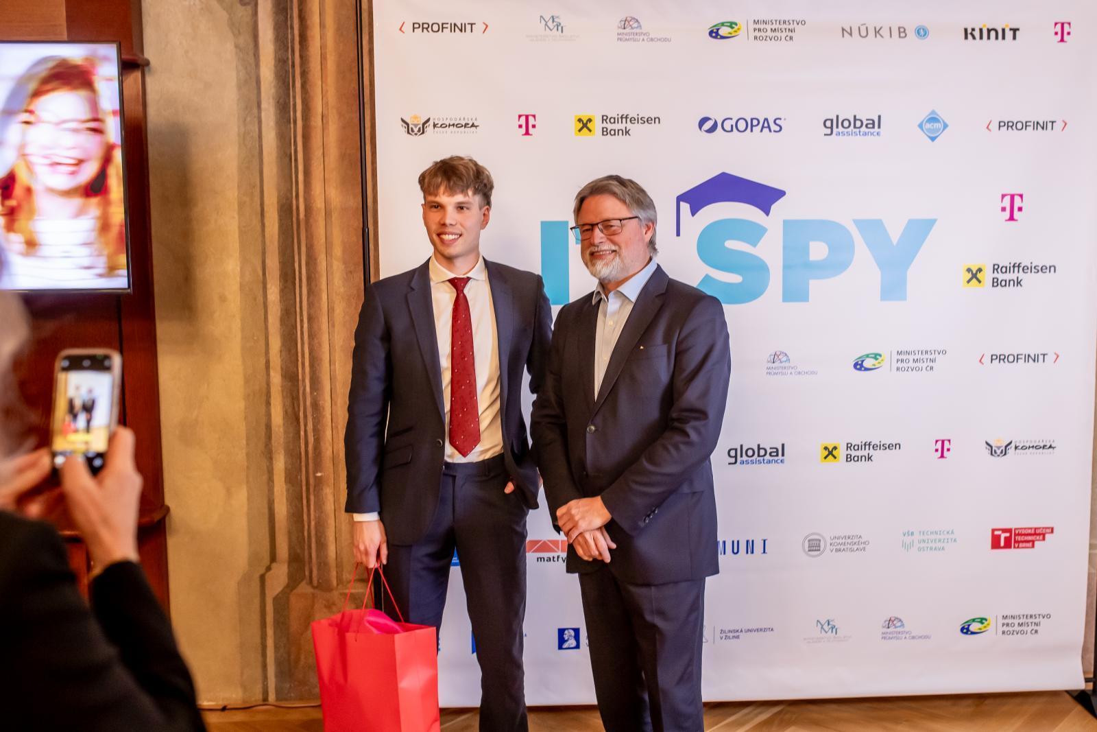 On Wednesday, November 19, 2025, the grand finale of the 16th edition of the prestigious international competition IT SPY took place, which selects the best theses in the field of computer science and information technology from leading Czech and Slovak universities. Theses from FIT often participate in the final round and end up at the top of the competition. This was confirmed again this year, when David Mihola, currently a doctoral student at the Institute of Computer Graphics and Multimedia, advanced to the final stage of the competition with his thesis "Smart Camera for Monitoring Objects of Interest." David ultimately placed in a respectable 4th–8th place out of dozens of submitted projects. David Mihola (left) during the final round of the IT SPY competition. | Author: IT SPYThe overall winner of the competition was Aneta Furmanová from FEE CTU with her work "Modeling the properties of the band structure of sonic crystals using machine learning," which focuses on the design of acoustic structures for reducing noise pollution with the help of AI.