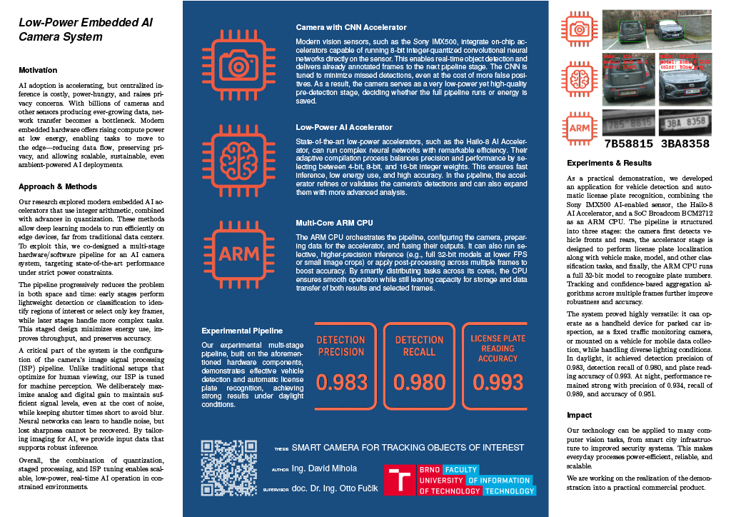 David commented on his result and its context for us: "I think the winning project really deserved to win. And, of course, all the others were also very interesting. Unfortunately, my internet connection dropped out during the demo of my prototype. If the presentation had been successful, I believe my thesis would also have made it onto the podium." He had already described the focus of his work for the faculty website: "My thesis shows that even on a small, battery-powered device, it is now possible to solve demanding artificial intelligence tasks – specifically, detecting vehicles and reading their license plates. This paves the way not only for independently functioning smart sensors, but also for devices to become part of larger systems, such as smart city infrastructure."