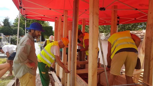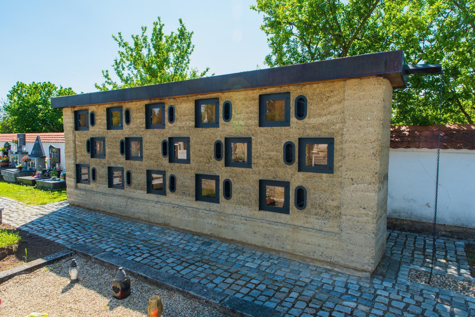 The columbarium was built by architects from FA BUT together with the municipality and volunteers during summer schools and workshops. They used the traditional rammed earth technique—processing local material themselves and creating a double-sided columbarium with thirty niches. The design, building permitting, preparation, and construction process was spread over four years, mainly to link the project with teaching, research projects, and community collaboration. Extending the construction period made it possible to involve several student cohorts (without interfering with regular teaching at the FA) and also helped distribute the costs over a longer period. Without breaks, the actual ramming of the load-bearing structure would have taken only about two weeks.