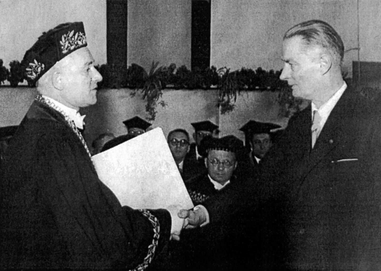 He describes this turbulent period in his autobiography. "When the situation in Czechoslovakia became increasingly unstable and I was privately warned that I was in danger of arrest and expulsion from the university, I decided with my wife and children to leave the country illegally – literally with nothing but the clothes on our backs. In July 1948, we successfully arrived in Belgium, where I was able to settle down and start working as a technical advisor to my friends in free Europe.” Honorary doctorate from the Technical University of Berlin-Charlottenburg (1956). | Author: Archive of Daniel Froněk, LCaŘ 128, no. 1, January 2012