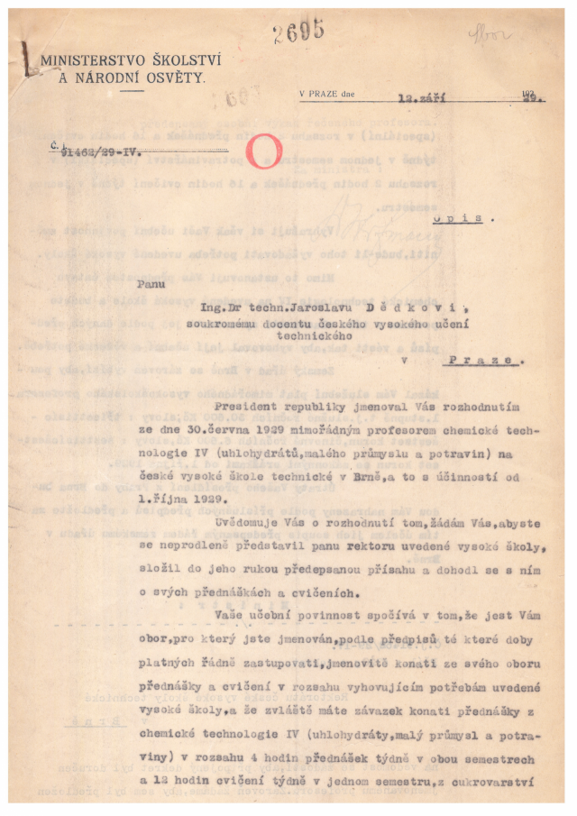 Jaroslav Dědek played a key role in the development of chemical engineering at BUT, especially in the field of carbohydrates and foodstuffs. In 1929, eighteen years after the establishment of the Department of Chemistry, he was appointed associate professor of Chemical Technology IV (Carbohydrates and Food) and became a full professor in 1934. In the academic year 1934/35, he held the position of dean of the Department of Chemical Engineering and from 1935 he was a member of the examination board for authorised civil engineers in technical chemistry. During his tenure, he also headed the Brno Sugar Research Station. Appointment of Jaroslav Dědek as extraordinary professor, part 1. | Author: BUT Archives At the beginning of his career at Brno University of Technology, Dědek faced a very difficult task – to reorganise and harmonise the established departments with their deeply rooted traditions and customs, while at the same time building new ones and striving to connect everything into a unified, functional whole. In addition to his teaching duties at the university, he worked closely with the sugar industry and designed completely new courses.