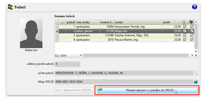 In IS Apollo, just open the result where you are the author (Research & Development -> R&D results). Now you can find the button Přenést záznam o výsledku do ORCID.