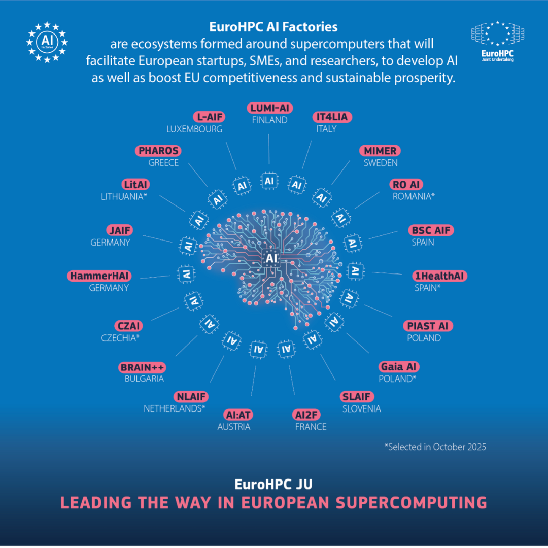 Celkové náklady na Czech AI Factory dosahují téměř 1 miliardy Kč, přičemž polovina je hrazena z evropské iniciativy EuroHPC JU a 50 % přispěje Česká republika. Mezi zřizovateli šesti nově ohlášených AI továren je kromě České republiky dále Polsko, Rumunsko, Španělsko, Nizozemsko a Litva. Nově otevřené AI Factories se připojí k 13 již dříve vybraným, vznikne tak propojená síť AI center, která budou připravena podporovat inovace v oblasti umělé inteligence v celé Evropě. Každá AI Factory bude fungovat jako jednotné kontaktní místo, které startupům, malým a středním podnikům, průmyslu, veřejným organizacím a výzkumným pracovníkům v oblasti umělé inteligence nabídne komplexní podporu při nasazování AI nástrojů, správě a zpracování datových sad, přístup k výpočetním prostředkům optimalizovaným pro AI atd.