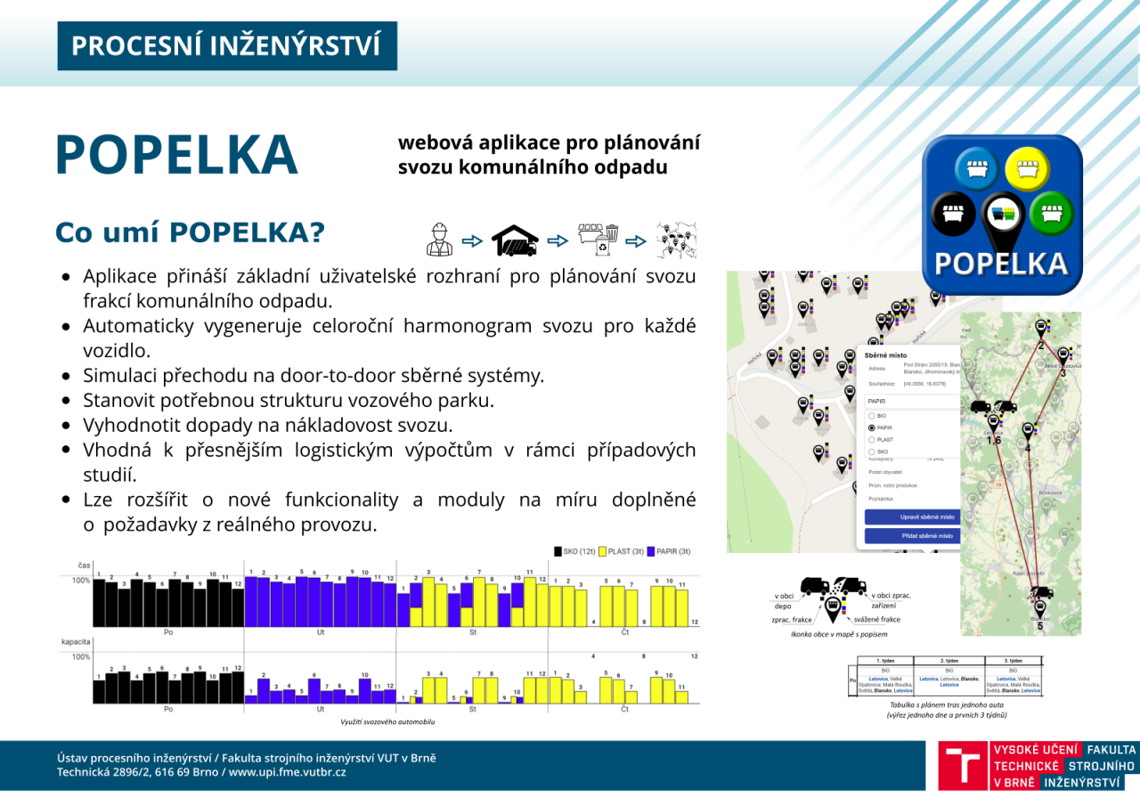 Výpočtový nástroj Popelka je koncipován jako webová aplikace. Uživatel nemusí instalovat žádné programy, stačí mu běžně výkonný PC, přičemž všechny výpočty běží na výkonném serveru. Popelka je aktuálně rozdělena na dva výpočtové moduly.První modul je zaměřen na definici sběrné infrastruktury v jednotlivých obcích, které patří do svozového meziobecního plánu. Modul umožňuje evidování jednotlivých producentů – adresní místa, firmy apod. – ke kterým jsou navázány existující sběrné nádoby včetně jejich parametrů (typ odpadu, frekvence svozu, velikost nádoby, technologie výsypu). V případě, že uživatel nemá přesné informace o sběrné infrastruktuře (např. zná jen počet sběrných nádob nebo nemá vůbec žádné informace), lze sběrné nádoby generovat s ohledem na nejkratší docházkovou vzdálenost. Zpracování dat sběrné infrastruktury probíhá na základě statistických a optimalizačních modelů, které doplní všechny potřebné parametry pro druhý modul – svozu odpadu (odhady doby obsluhy nádob a sběru v rámci ulice, shlukování do ucelených oblastí na základě kapacitního omezení vozidel a pracovní doby).Druhý modul se zaměřuje na plánování meziobecního svozu odpadu. Uživatel si definuje množinu obsluhovaných obcí, vozový park a jeho parametry. Důležité parametry zahrnují pracovní doba a možnost přesčasů, umístění dep a koncovek pro jednotlivé frakce odpadu (může být více). Pro každou obec a frakci odpadu lze definovat povolené dny svozu a spoustu výjimek, aby bylo možné pomocí nástroje modelovat reálné svozové plány. Návrh svozu je možné konstruovat zcela automaticky nebo tento výpočet kombinovat s manuálními zásahy. Uživatel si pak zadá část svozových tras napevno a zbytek nechá doplánovat automaticky. Výsledky výpočtu jsou zobrazovány v mapovém podkladu, dále v harmonogramu a v tabulkách včetně nejdůležitějších statistik, aby bylo snadno použitelné při předání posádce vozu.S ohledem na naplánovanou svozovou trasu mezi jednotlivými obcemi je možné optimalizovat průjezd každou obcí na úrovni sběrných míst (již je definována příjezdová a výjezdová strana obce). Doplňující funkcionality umožňují automatizované generování záznamů o provozu vozidla pro využitá vozidla pro každý den nebo tvorbu svozových kalendářů pro jednotlivé obce (producenty).