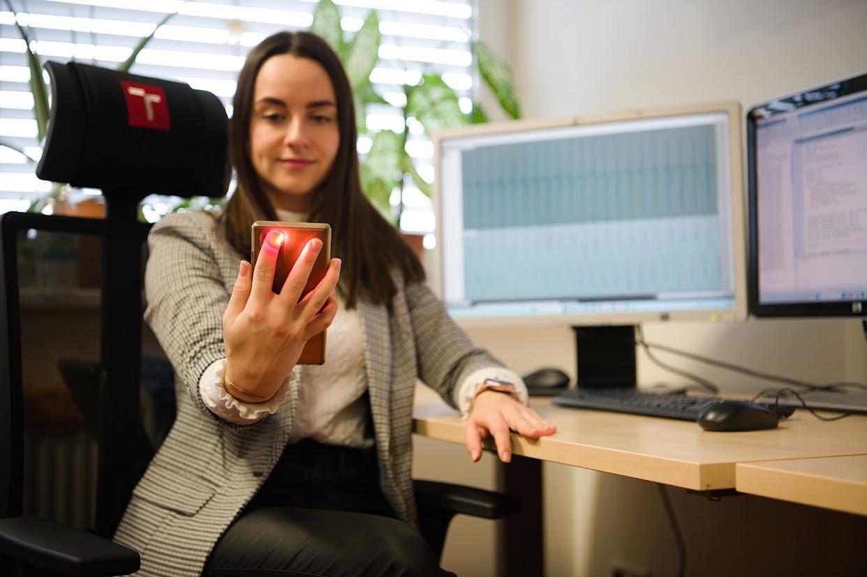 Snímání PPG pomocí videozáznamu v telefonu. | Autor: Oto JanoušekPPG signály se ve zdravotnictví používají už delší dobu a o jejich možnostech se ví. Lze z nich získat informaci například o tepové frekvenci, dechové frekvenci, saturaci krve kyslíkem nebo o krevním tlaku. „Stanovením krevního tlaku se mimochodem zabývá můj kolega Ing. Jan Šíma,“ dodává Enikö.