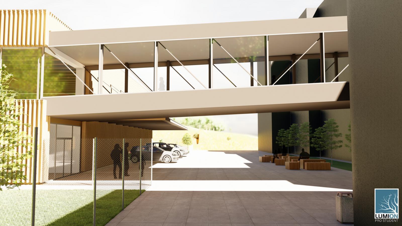 Velkou část tělocvičny také zapustil do země. „Snažil jsem se ji udělat co nejmenší. Má asi deset metrů na výšku a nechtěl jsem, aby zastiňovala školu a ostatní části pozemku. Proto vystupuje na povrch jen to, co je nutné,“ dodal Martin Čermák. Šatny se tak nacházejí celé pod zemí a nad nimi navrhl oceněný student venkovní hřiště. „Pozemek je v mírném svahu. Skloubit různé výškové úrovně, uvědomit si, kde musí být jaké rozestupy, aby to celé fungovalo, bylo to nejtěžší na celém projektu,“ podotkl Čermák.