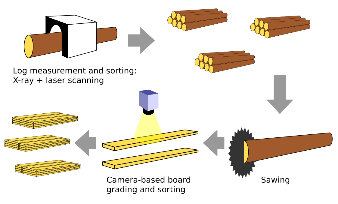 Inspekce se provádí jak na pokácených stromech, tak následně na prknech. „Nejprve kmeny nasnímáme pomocí kamery či rentgenu. Následně na obrázcích hledáme vady dřeva. Například suky, hnilobu a řadu dalších věcí. Podle toho se pak rozhoduje, jak bude dřevo nařezáno a na co bude využito. Po nařezání se pak provádí inspekce standardními kamerami,“ upřesnil finský výzkumník.
