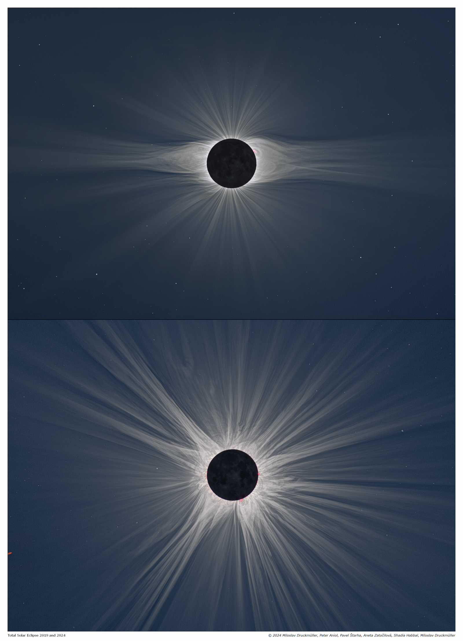 Srovnání sluneční koróny v období blízko minima (nahoře) sluneční činnosti a maxima (dole). Horní obraz byl pořízen v Chile v roce 2019, dolní v USA v roce 2024.