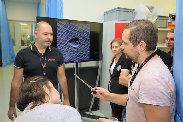 se odehrával na půdě firmy Thermo Fisher Scientific. Právě brněnské technologické centrum je jedním z největších výrobců elektronových mikroskopů na světě. Studenti mohli v laboratořích nahlédnout do vnitřností různých typů mikroskopů. „Ukázali nám dva druhy elektronových mikroskopů, které vyvíjejí. Já jsem si vybral ukázku rastrovacích mikroskopů, které jsou schopny prosvítit strukturu materiálu a pomocí elektronů něco vyrýt na jednotlivé částice. Takové přiblížení jsem si nedokázal představit,“ popsal Matěj Poláček z Fakulty elektrotechniky a komunikačních technologií, který byl mezi čtyřiadvaceti účastníky.
