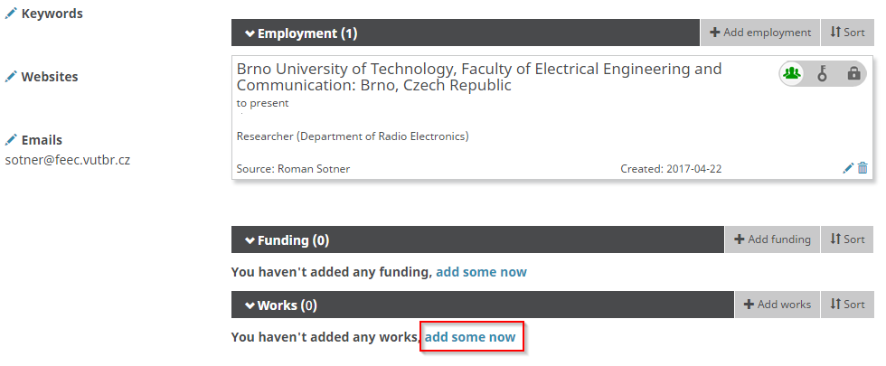 Po přihlášení do svého profilu na ORCID, klikněte na záložku Works a tlačítko add some now.