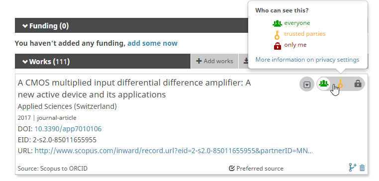 Data byla odeslána. Jejich zobrazení je možné v ORCID v záložce Works, kde je zároveň možné nastavit viditelnost jednotlivých záznamů a jejich pořadí.