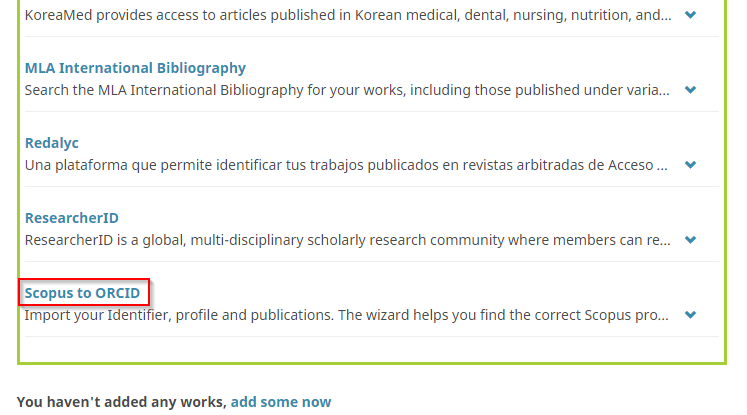 Z nabízeného seznamu služeb vyberte Scopus to ORCID.
