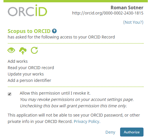 Systém vás vyzve k udělení přístupu Scopusu pro práci s vaším ORCID profilem. Zmáčkněte tlačítko Authorize.