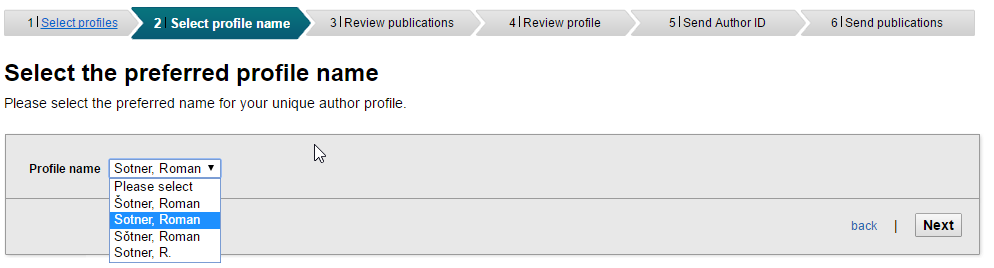V následujícím kroku vám databáze nabídne možnost zvolit preferované jméno pro vás Scopus profil. Vyberte nejužívanější variantu a klikněte na tlačítko Next.