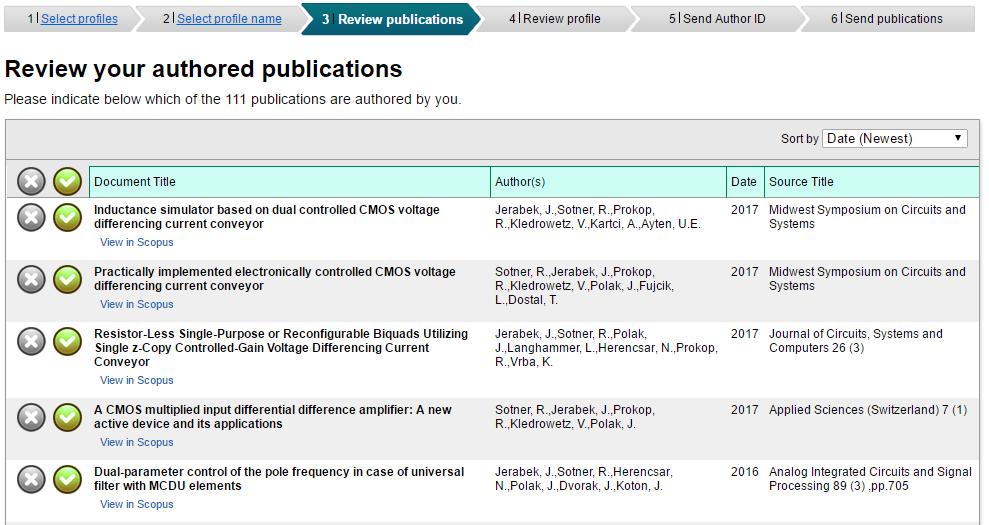 Scopus vám nabídne seznam publikací spojených s vaším profilem. Projděte prosím dané publikace, pokud by publikace nebyla vaše, lze je z profilu odstranit kliknutím na křížek.