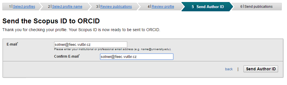 Nyní již můžete zaslat, veškeré informace ze Scopus profilu do ORCID. Jako první se propíše vaše Scopus ID do ORCID. Stačí pouze vyplnit váš e-mail a potvrdit tlačítkem Send Author ID.