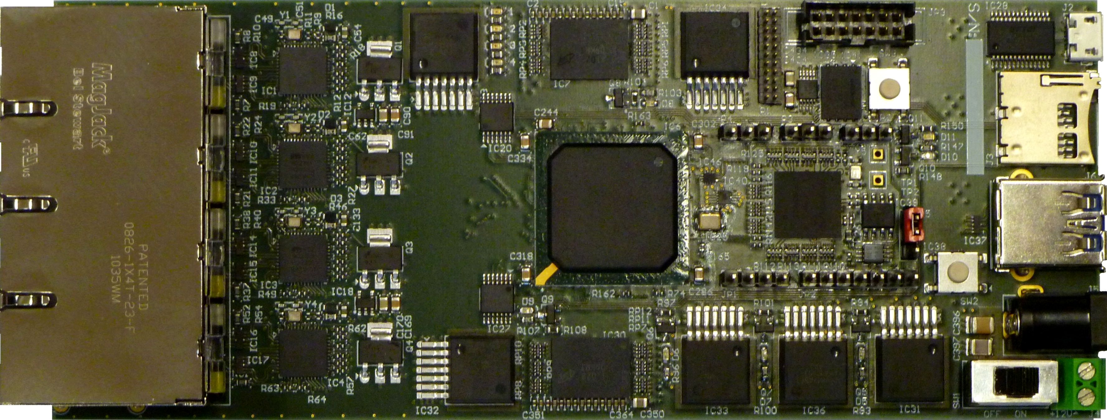 Embedded FPGA platform for gigabit network applications (u4G-150) is a FPGA-based board developed for wire-speed acceleration and/or processing of network packets up to 1 Gbps. It consist of a powerful Xilinx Spartan-6 FGPA of biggest size and speedgrade. It will be used also as an experimental platform.Platform uses four metallic RJ45 ports for network connectivity, two 256 MB DDR3 memories for fast local data storage or system RAM, 16 MB boot flash for FPGA device which can be also used as a slow persistent local data storage, slot for micro SD(HC/XC) memory cards, powerful USB3.0 chip for high performance transfers to computer or attached storage device (USB flash disc), serial (UART) connection with micro USB Type B connector and standard JTAG connector used mainly for easy debugging and finally some signalization LEDs. It also consists of other components (power components, crystals, passive components etc.).Development for u4G-150 platform is fully under Xilinx EDK (Embedded Development Kit) and Xilinx SDK (Software Development Kit) with own port of Linux for MicroBlaze 8.00.b processor and bootloader for SD(HC/XC) memory cards. Some other details can be found in the technical report (in Czech). Please contact authors if you are interested in this software support.