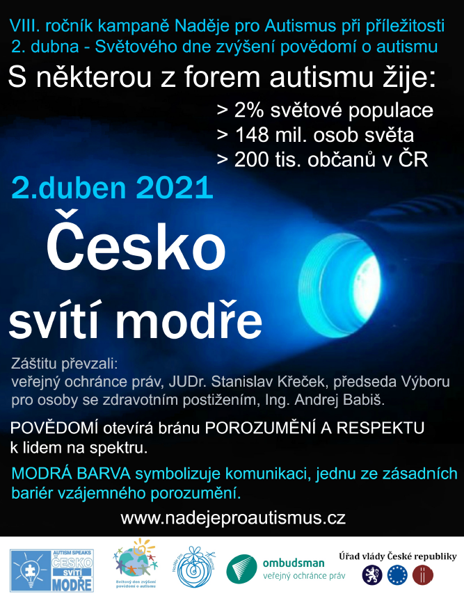 V tento den se řada budov po ČR nasvítí modrou barvou v rámci akce Česko svítí modře, kterou pořádá organizace Naděje pro autismus už osmým rokem. Lidé s poruchou autistického spektra (dále jen PAS) tvoří zhruba