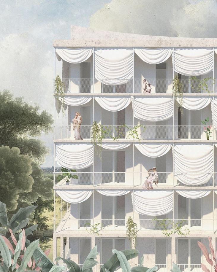 Celým návrhem prostupuje motiv cyklicity, který je nejzřetelněji vyjádřen pomocí centrálního kruhového atria, okolo kterého jsou ovinuty čtyři vertikální objemy, přičemž každý z nich má za úkol reprezentovat konkrétní fázi těhotenství," vysvětlují studentky v popisu projektu. Navržené centrální atrium pak pracuje s motivem rajské zahrady a autorky pro areál porodnice navrhly také speciální systém tří fasád.