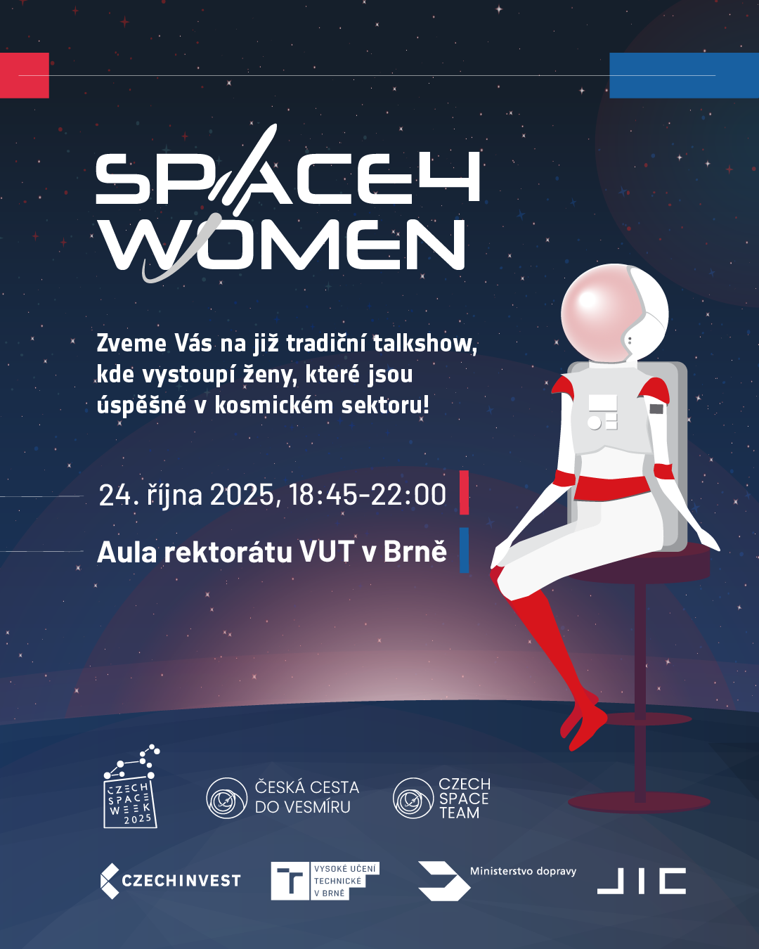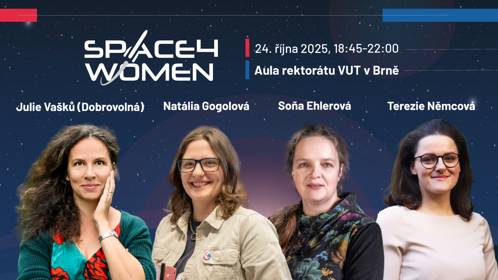 Na pódiu ve dvoraně Rektoráru VUT se potkají čtyři ženy, které vyvrací stereotypy o tom, že vesmír je jen pro muže. Ukážou, že space je zajímavý a že je v něm více než dost místa pro ženy, které chtějí objevovat. Těšit se můžete na Soňu Ehlerovou, astronomku z Akademie věd ČR a delegátku Česka v Evropské jižní observatoři, Natálii Gogolovou, která pracuje jako systémová inženýrka ve Spacemanicu a podílela se na satelitech Veronika, GRBBeta, CroCube i LasarSat. Dále pak na Julii Vašků Dobrovolnou, která je univerzitní koordinátorkou pro výzkum vesmíru na Masarykově univerzitě a Terezii Němcovou, popularizátorku kosmického práva a specialistku pro kontrolu exportu v oblasti aerospace, se zkušenostmi z ESA a Airbus.