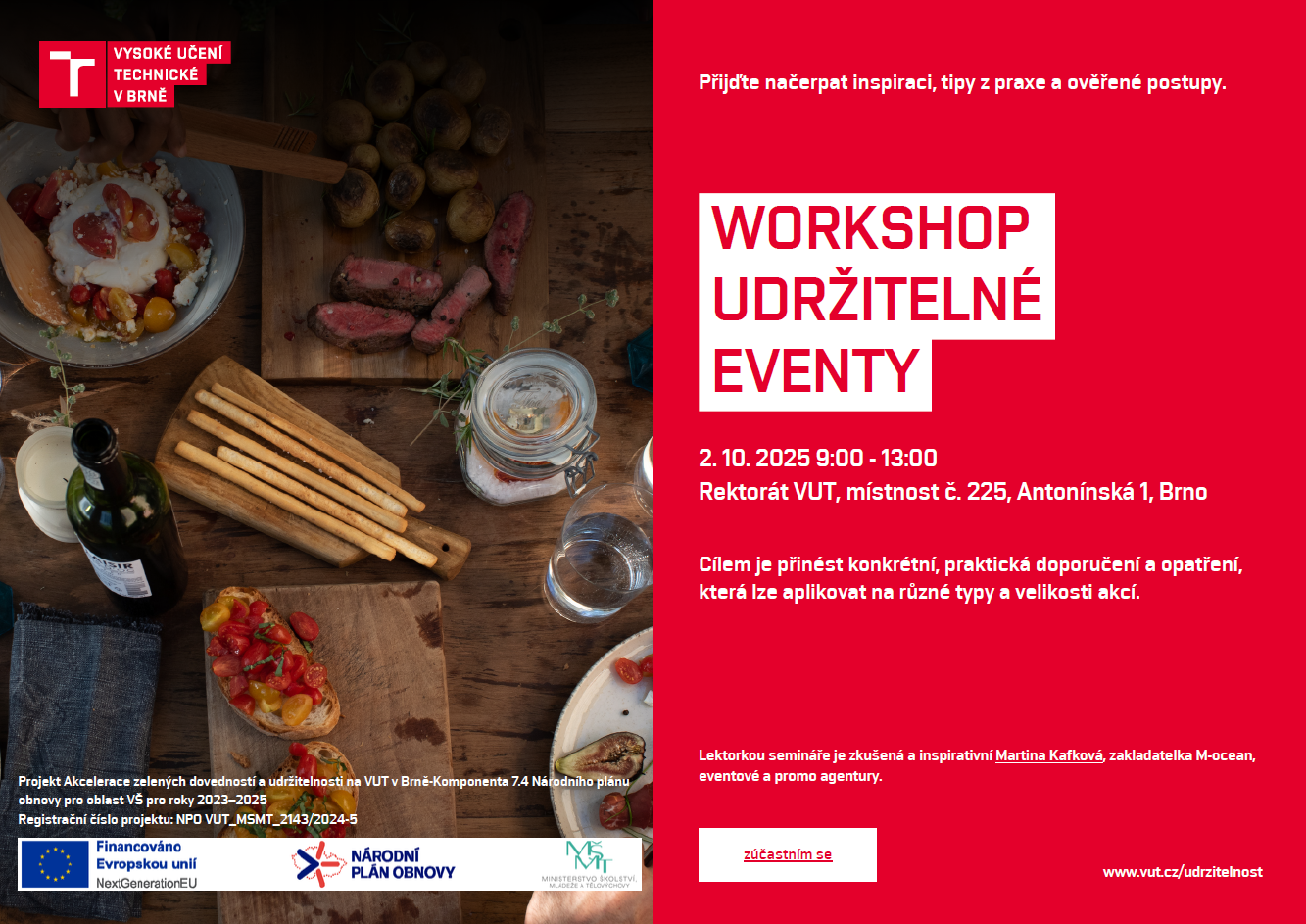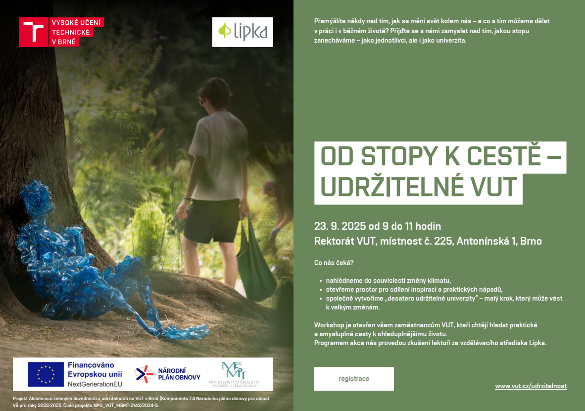 Přemýšlíte někdy, jak se mění svět kolem nás a co můžeme změnit v práci i v běžném životě? Pro zaměstnance VUT je připraven workshop Od stopy k cestě, který je provede souvislostmi klimatické změny, nabídne prostor pro sdílení inspirací a vyústí ve společnou tvorbu „desatera udržitelné univerzity“. Registrace zde.
