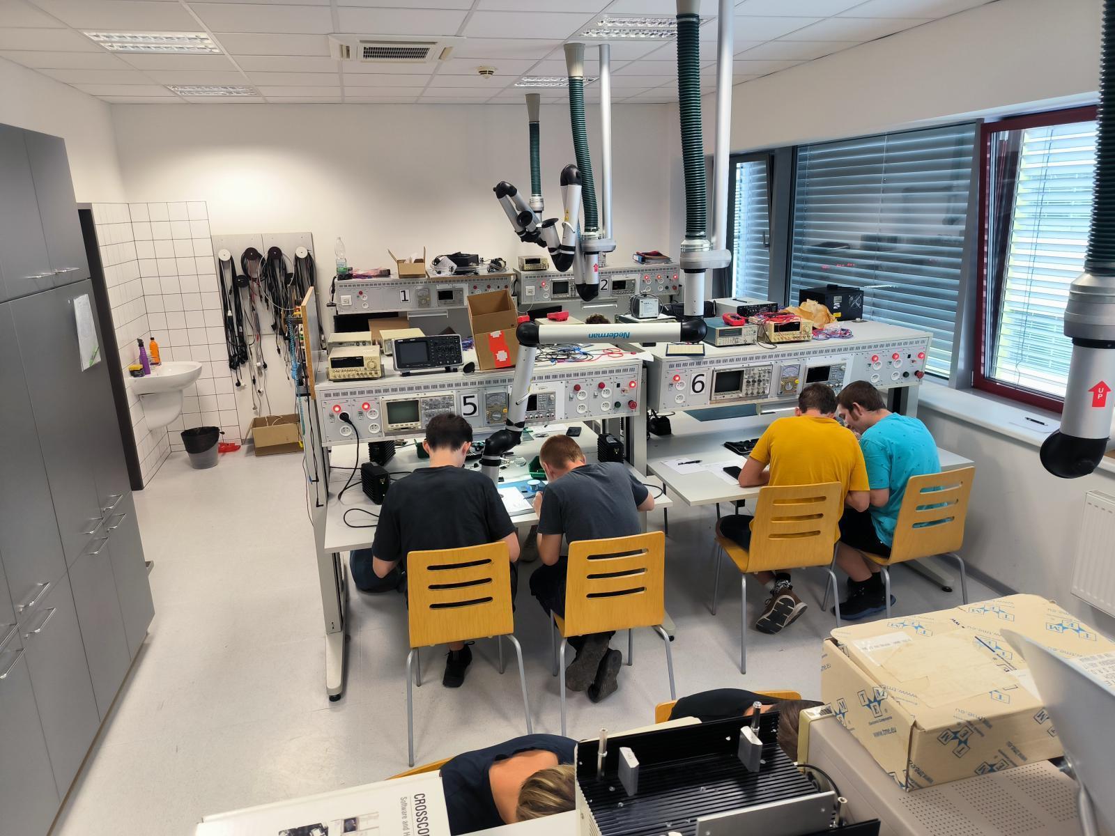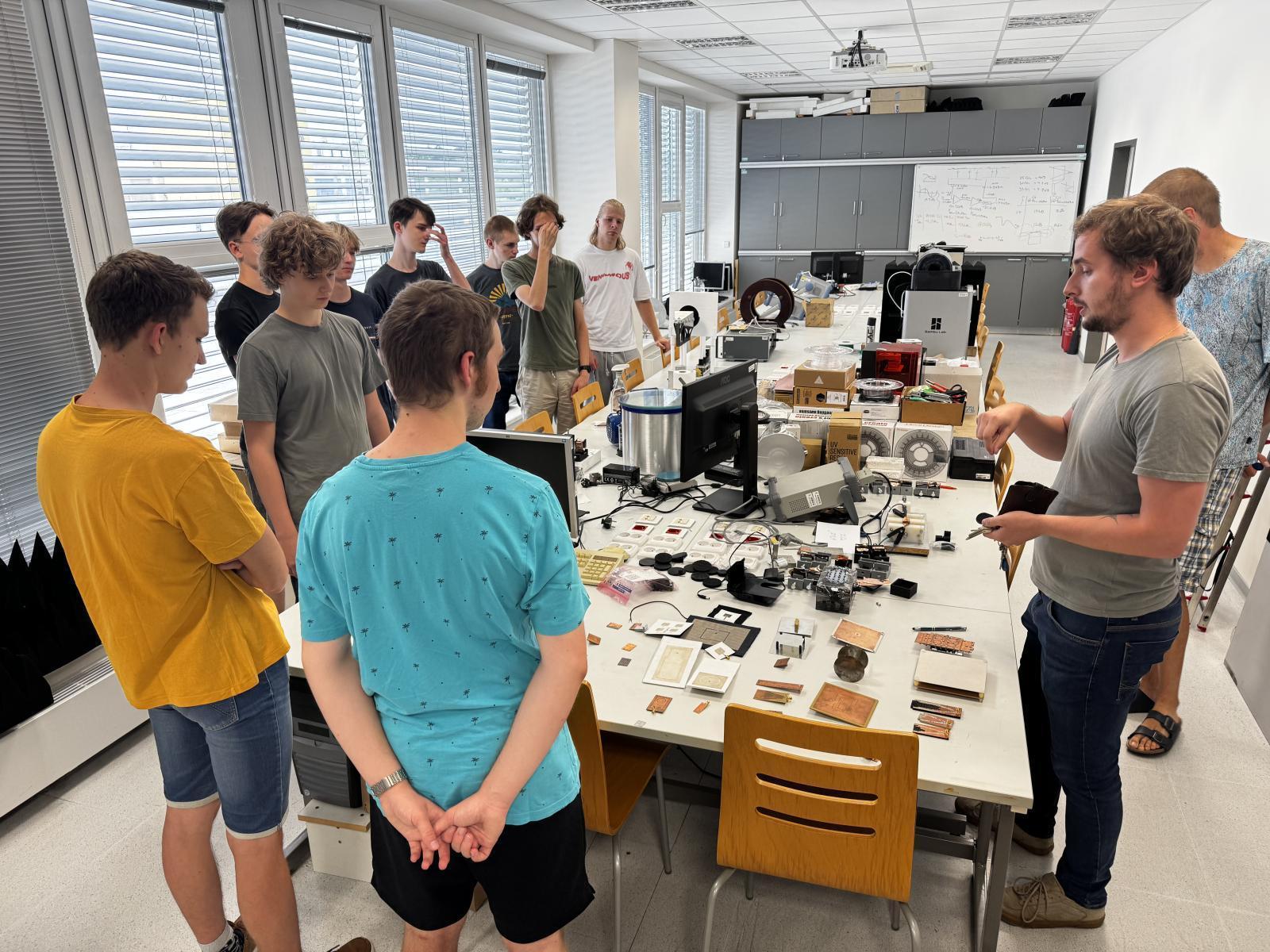 Workshop radioelektroniky 2025: Mise s dopadem. | Autor: Šimon SlobodaOdpolední program rozšířil obzory studentů prostřednictvím komentované prohlídky špičkových laboratoří Ústavu radioelektroniky. Navštívili laboratoř elektromagnetické kompatibility, kde se seznámili s principy měření rušení elektronických zařízení, laboratoř optických komunikací demonstrující nejmodernější technologie přenosu dat světlem, laboratoř antén s pokročilými měřicími systémy a laboratoř experimentálních satelitů, která představuje špičku českého kosmického výzkumu.