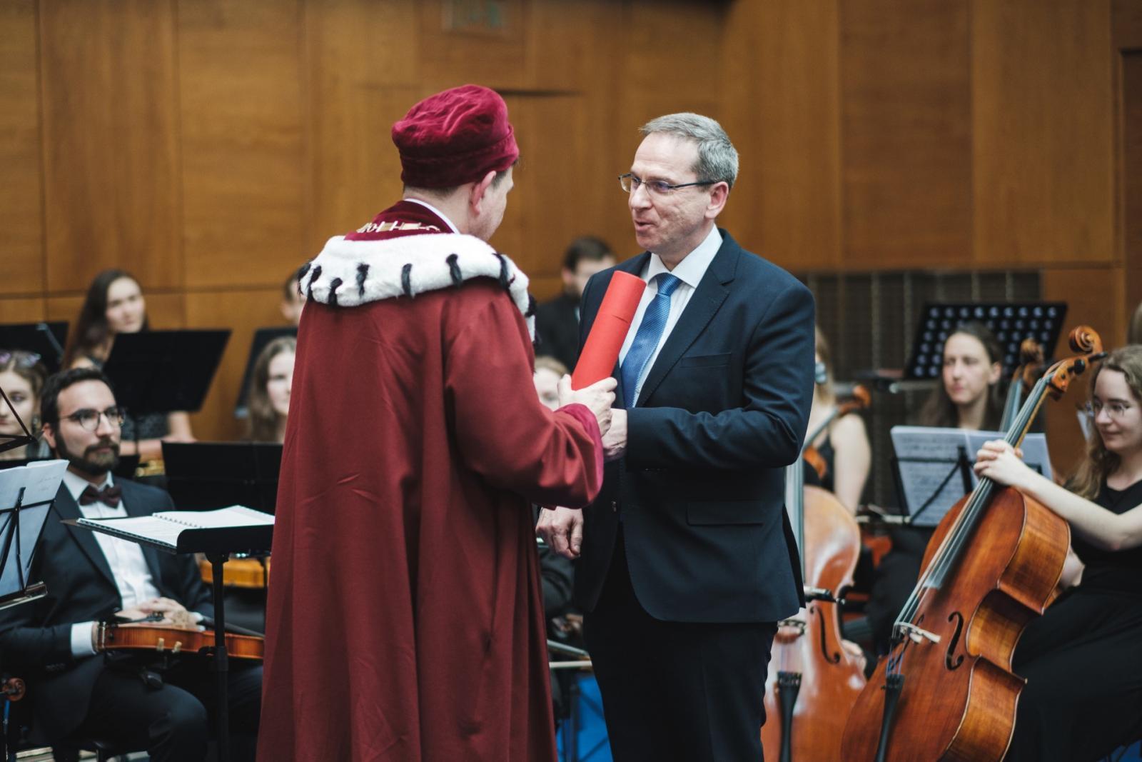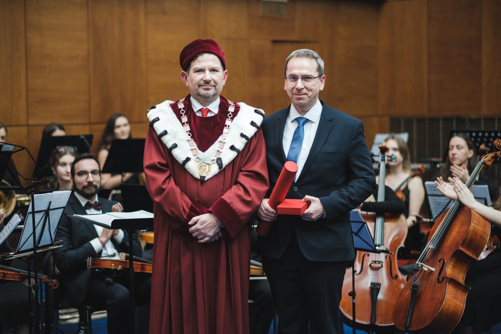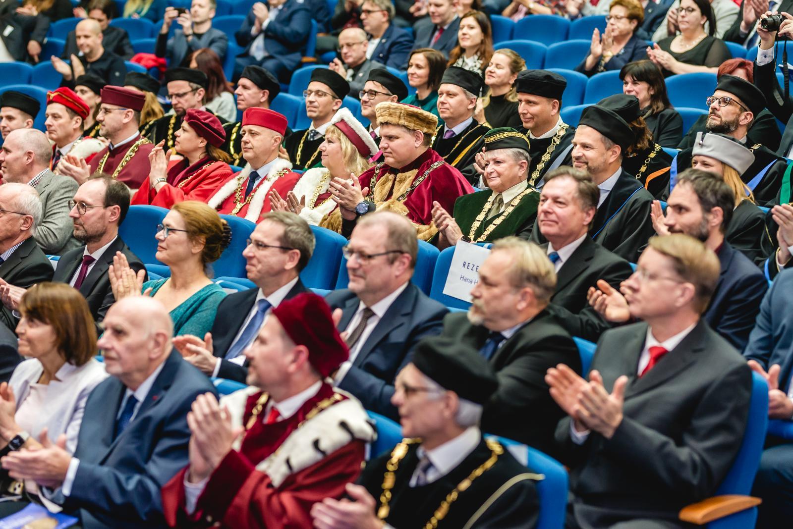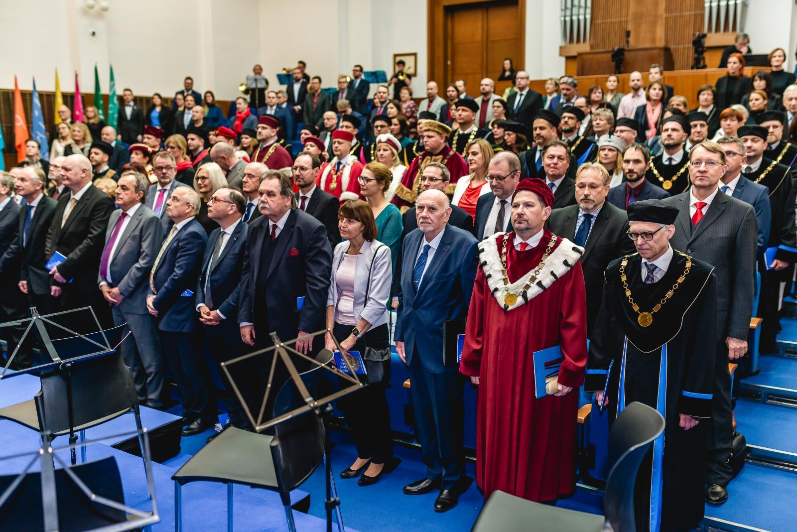 Shromáždění při příležitosti předávání medailí MU významným představitelům vědy, kultury, vysokého školství a veřejného života | Autor: Martin Šteiner“Udělením Zlaté medaile Masarykovy univerzity se mi dostalo velké pocty a já ji přijímám s velkou pokorou. Je to ocenění, které patří všem, se kterými jsem na všech projektech i každodenních úkolech a tématech v průběhu mého působení na MU spolupracoval a bez jejichž podpory by výsledky nejspíše nebylo možné dosáhnout. Velice si ocenění i za tyto své kolegy vážím a děkuji rektorovi, profesoru Martinovi Barešovi, za nominaci a udělení této významné ceny. Je mi také ctí být na seznamu mezi dalšími oceněnými osobnostmi, kterých si nesmírně vážím, a jsem rád, že jsou mezi nimi kolegové, se kterými jsme dobu těch velkých projektů prožívali společně, když jsme byli ve vedení univerzity,” uvedl rektor VUT ke včerejšímu významnému ocenění.