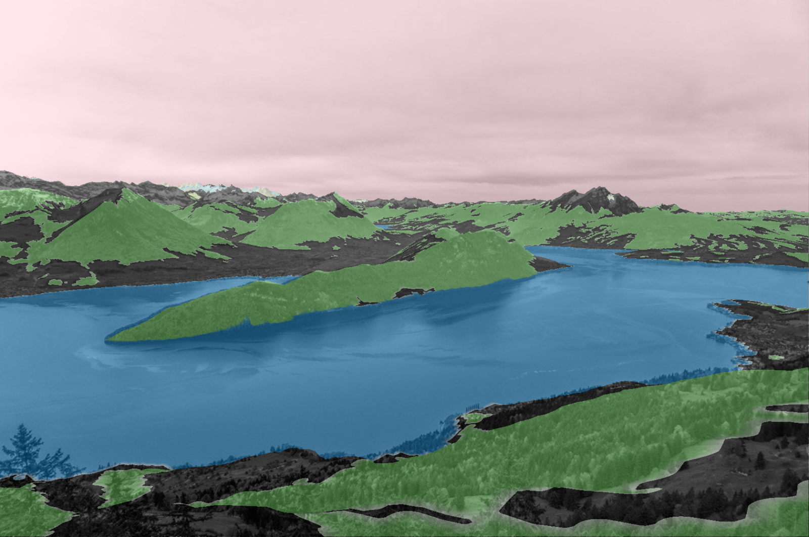 Systém detekuje vodu (modrá), lesní porost (zelená) i oblohu (růžová) | Autor: archiv výzkumné skupiny CPhoto@FIT