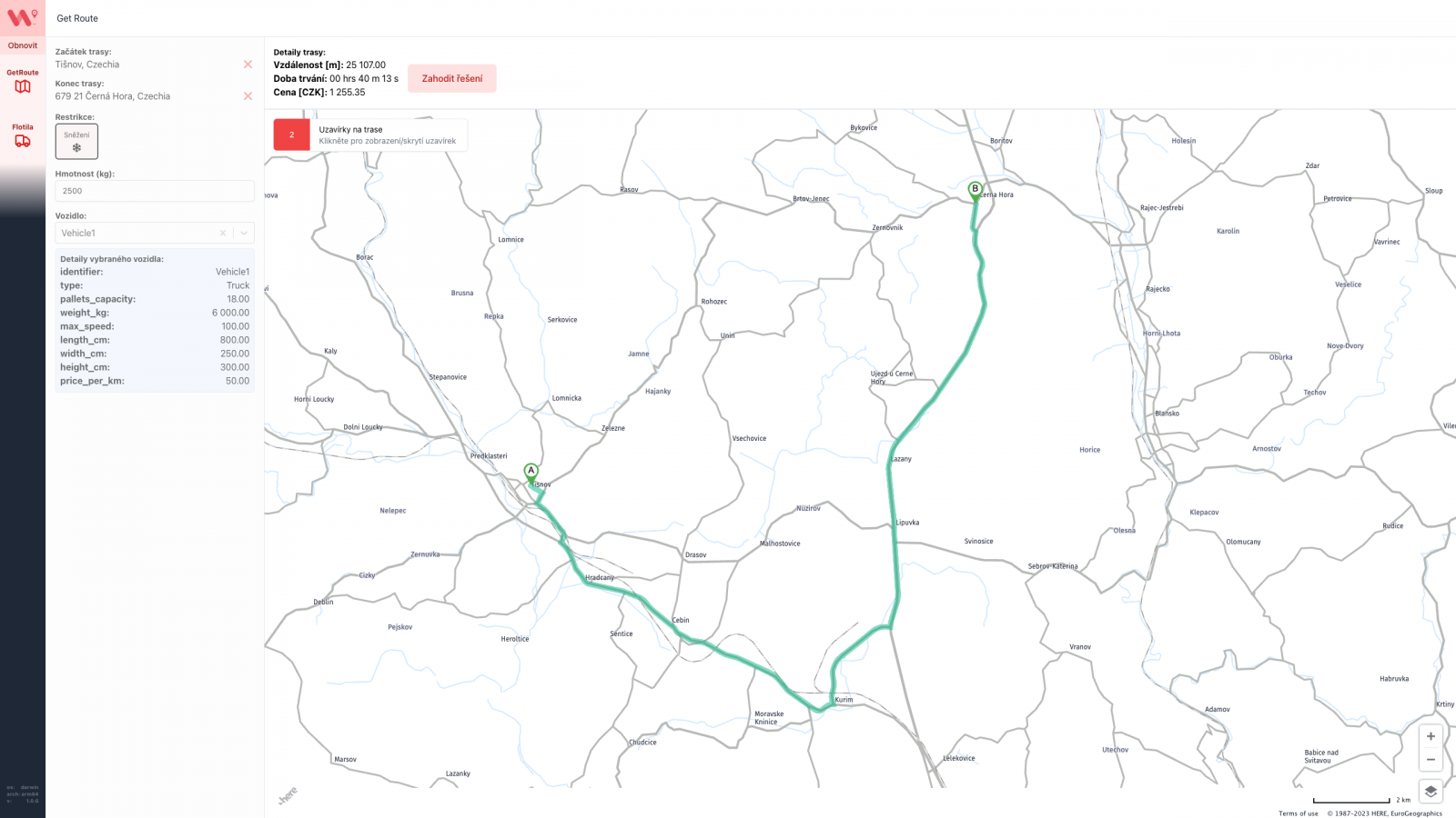 „Navíc náš software nabízí uživatelské rozhraní, v němž si může uživatel aktualizace dělat i sám. Dáváme tak dispečerům možnost využít to nejcennější – jejich dlouholeté zkušenosti. Když například sněží a dispečer ví, že nějaké stoupání je v zimě problematické, sám si vyznačí „uzavírku“ a software trasu přepočítá,“ dodává Vašík.Ukázka prostředí aplikaceOptimální trasu software plánuje ne podle počtu ujetých kilometrů, jak bylo doposud zvykem, ale podle celkové ceny přepravy. V ní hraje roli nejen vzdálenost, ale i čas, převýšení a další parametry. „Museli jsme například vyřešit penalizaci některých manévrů: třeba když odbočujete na světelné křižovatce doleva, strávíte na ní více času, cesta se prodlouží a tím i prodraží,“ popisuje Ivan Eryganov, který na vývoji softwaru pracoval ještě jako doktorský student programu Aplikovaná matematika, nyní je již zaměstnancem Ústavu matematiky.